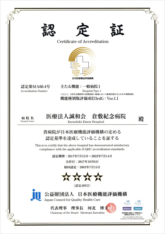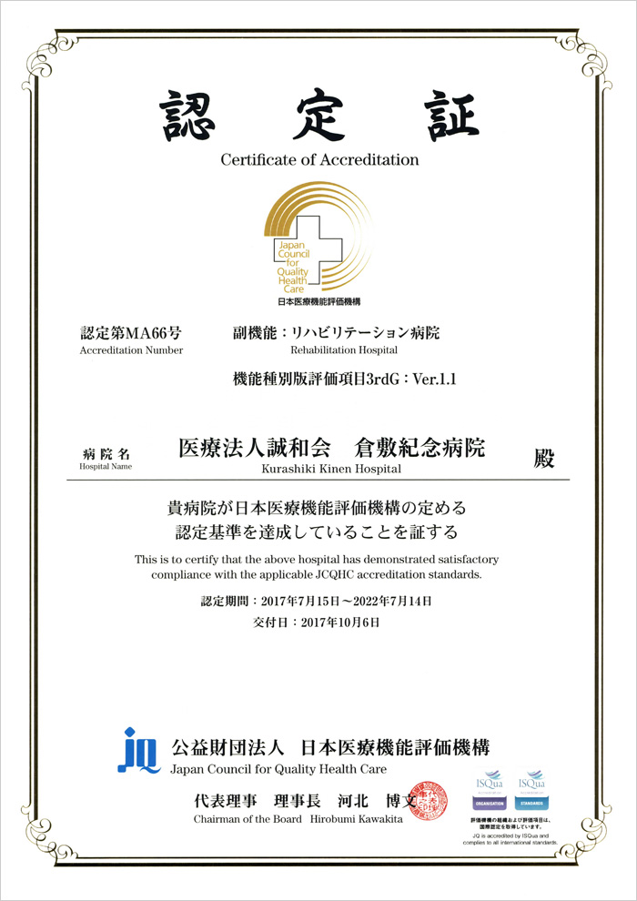 倉敷紀念病院は、(財)日本医療機能評価機構より「主たる機能:一般病院1、副機能:リハビリテーション病院 機能種別版評価項目3rdG:Ver.3.0」の基準を満たす病院として認定されています。
