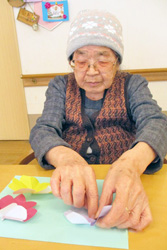 「まあ~綺麗、どの色にしようかしら」と言われ、職員と一緒に頑張って作りました。その後はみんなで美味しいおやつの時間を過ごしました。